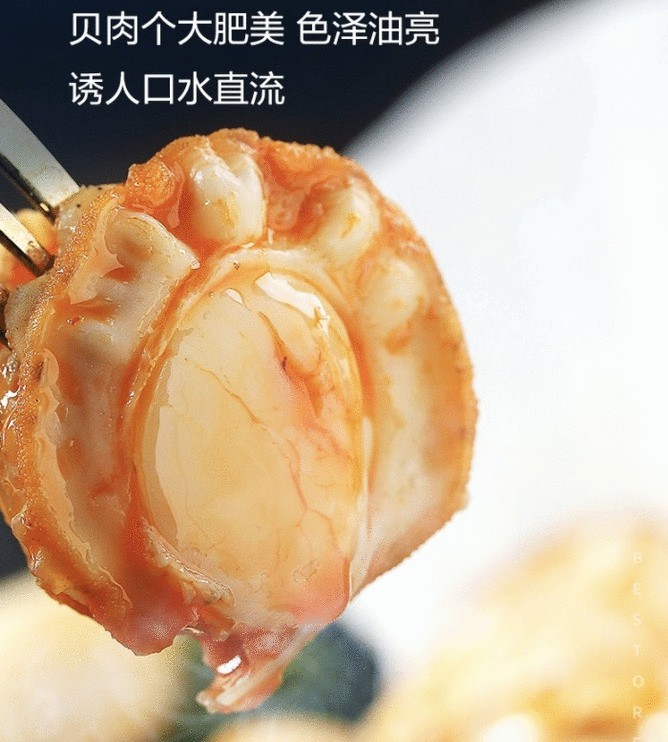 「 蒜蓉扇贝」对于海鲜迷来说,一粒又大又圆、肉又饱满味道又好的扇贝,是劳累一天后的人间美味!来自北纬39°海域的虾夷扇贝,每个年龄只有1岁,筛选后用日本新含气调理技术进行处理,让你尝鲜到底~