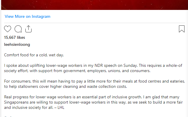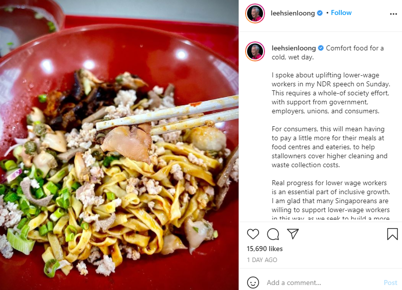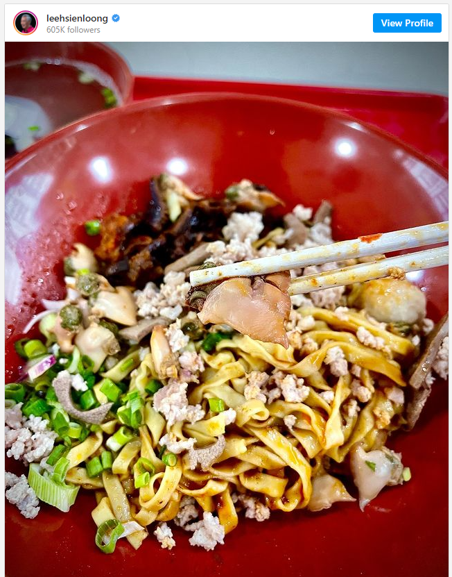Comfort food for a cold, wet day.“在湿冷的天气吃舒服的食物“,李显龙总理晒出一张自己拍的美食照片。(以上截图:INS@李显龙)看这红红的塑料碗碟,还有接地气的摆盘,是小贩中心没错了。然后这熟悉的碱面配上肉碎,不就是肉脞面嘛!好多人才知道,原来总理竟然也吃小贩中心呀。早在几年前,李显龙就被人拍到在小贩中心排队,安静地站着非常斯文。另一些照片显示,他们还是全家一起出动吃饭。不过后面的便衣保镖提醒你,莫轻举妄动~过去路透图(网友拍摄)李显龙总理是小贩中心的坚定爱好者,每次他排队或晒单的店,都会被人扒出来成为网红店。这次的肉脞面也不例外!经过网友发动福尔摩斯般技能,终于扒出李总理吃的这家是位于四美民众俱乐部。由肥雄餐饮集团开设的潮州面摊就有售卖肉脞面加蚶。(图源:mothership)李显龙总理的“带货”能力了得,有记者去采访这家面摊,负责人说确实客流量增加了不少。负责人还透露,这可能不是李显龙总理第一次光顾。之前就有总理公署的职员前来打包肉脞面,特别要求加蚶,想来可能是帮李总理打包。肉脞面加蚶原来别有深意当然,李显龙作为一国总理,不会只发个面条表达喜爱这么简单。让我们再仔细看看这碗面。正常的肉脞面有香菇、鱼丸、猪肝、虾、贡丸、猪肉片、云吞、肉末等配菜。至少香菇+猪肉片+猪肝+肉碎是必须的。但是很少见有人加蚶(又叫血蛤)~这大概就是李显龙总理的个人独特喜好吧。