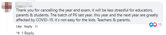谢谢你取消年终考试,这对教育工作者、家长和学生来说压力会小一些。去年、今年和明年的小六学生受新冠的影响很大,这对孩子、老师和家长来说都不容易。