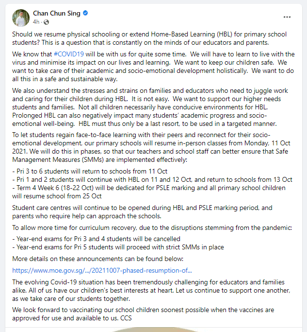 教育部长陈振声专门发了一篇贴文解释原因,并且呼吁大人小孩都要学会跟新冠相处: