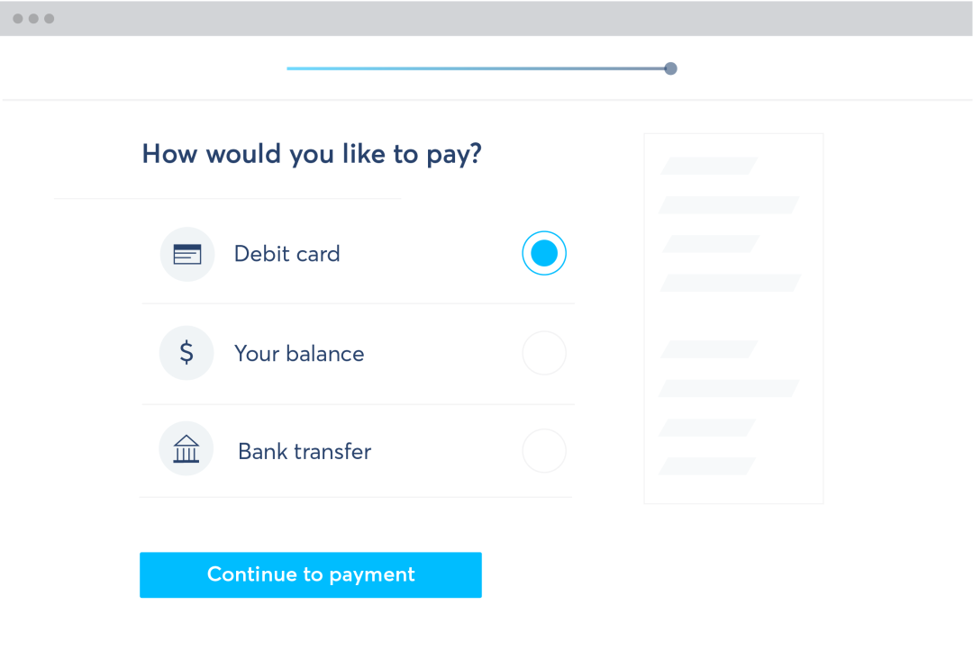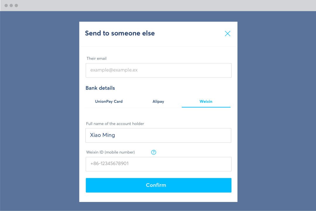 支付您的汇款数额及汇费。在新加坡的您可使用银行转帐、PayNow、信用卡和借记卡等等支付。