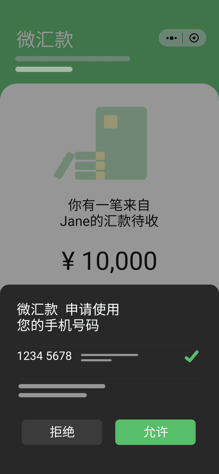 3)“微汇款”申请使用你的手机号码,点击“允许”