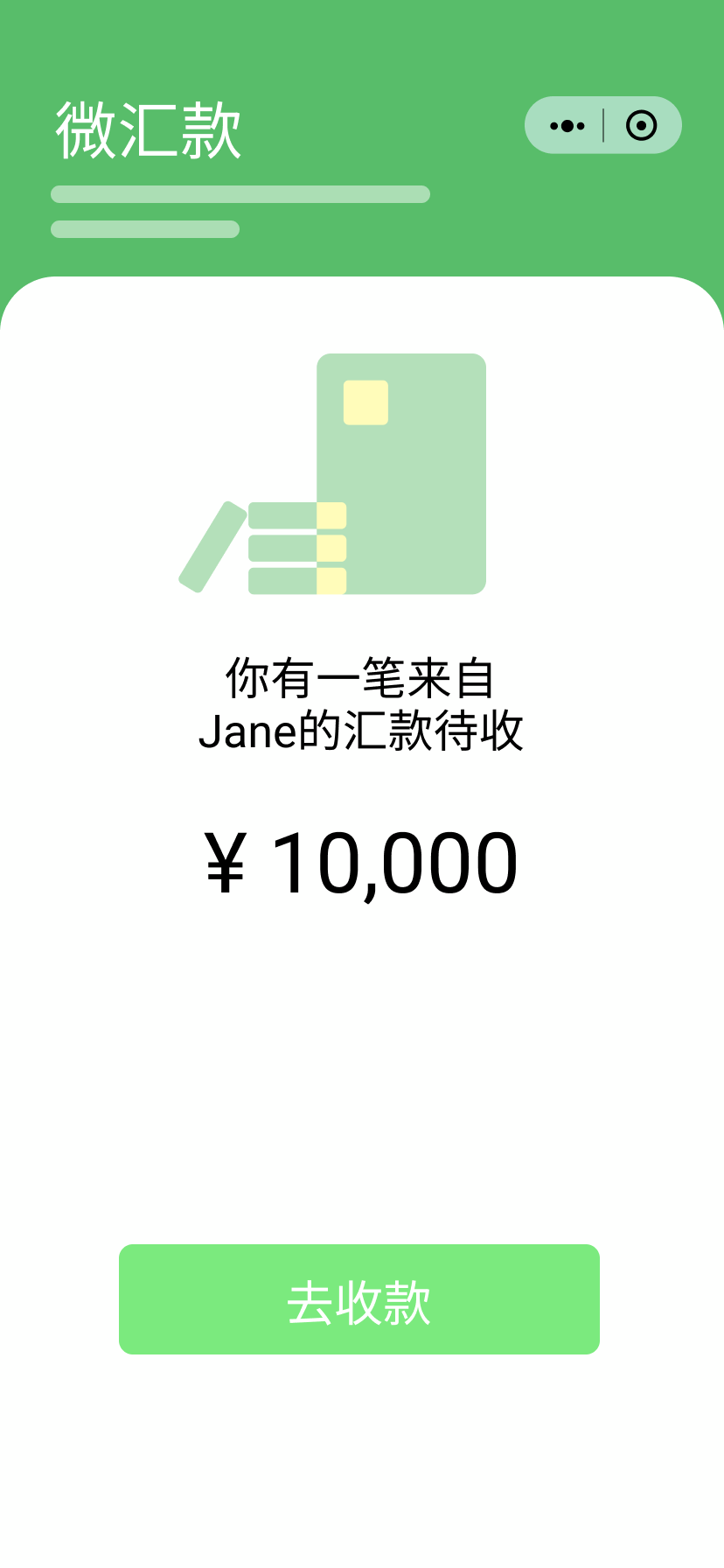 小提示:您的收款人也可随时在微信APP中搜索打开“微汇款”小程序,选择全球收款,并按照步骤事先授权绑定接收汇款的银行卡,方便收款!