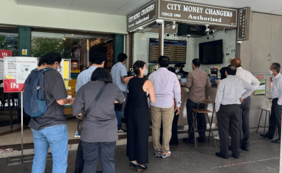 在莱佛士广场的拱廊,几乎每个货币兑换商都有10至15人排队。