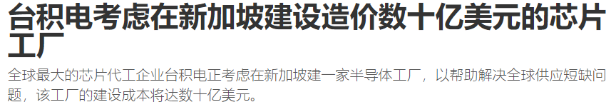 2022年5月消息,据外媒报道,全球最大的芯片代工企业台积电正考虑在新加坡建厂增加半导体产能,以帮助解决全球供应短缺问题。
