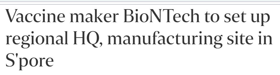 2021年5月10日,德国疫苗厂商BioNTech(联合生产辉瑞疫苗的公司)宣布BioNTech将在新加坡设立东南亚区域总部,并建立一座生产信使核糖核酸(mRNA)疫苗的设施。