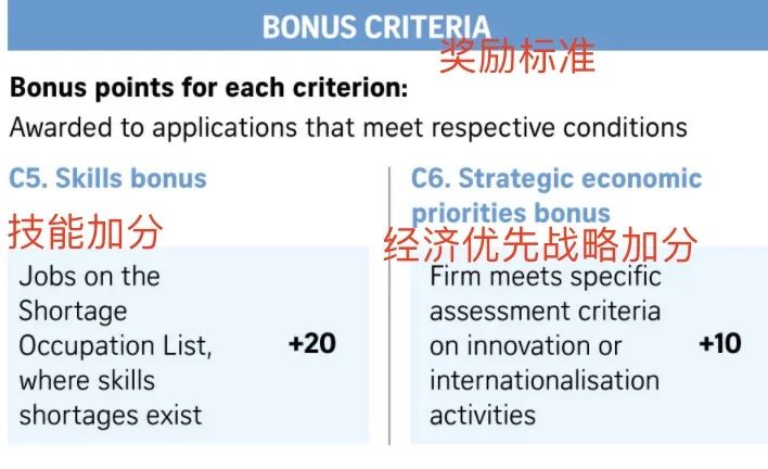 意思就是说:如果你从事的是新加坡紧缺职业清单上的工作,那么可加分20。如果你所在公司符合创新或国际化特定评估标准,那么可加分10。