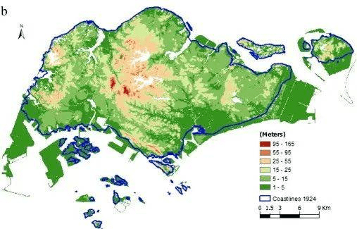 与此相对的,新加坡的大士、裕廊岛一带,新加坡CBD市中心,新加坡东海岸以及新加坡巴西立、樟宜一带,地势低洼海拔往往只有1到5米。