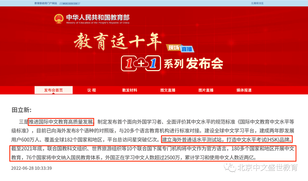 截至2021年底,10个联合国下属专门机构将中文作为官方语言,全球有76个国家将中文纳入国民教育体系,中国以外正在学习中文的人数超过2500万,累计学习和使用中文人数近2亿。