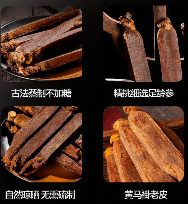 优势:精选足龄优质红参,古法蒸制不加糖,自然晾晒而成,无添加化学硫制。有助调节血压、抗疲劳、安神补脑~