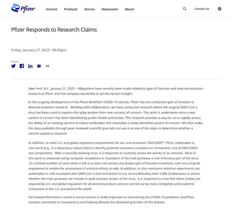 面对山海般的质疑,辉瑞也坐不住了,1月27日,公司在其官网上发表文告,表示已经关注到目前有人指控辉瑞在进行病毒的功能获得或定向进化研究,但对于指控辉瑞进行了否认。