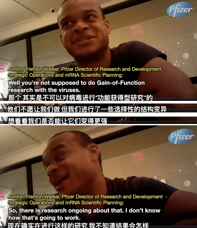Project Veritas称,机构旗下有一名卧底于辉瑞公司的人士,从一位“辉瑞研发部门主管”Jordan Trishton Walker(以下简称Jordon)口中套出了话,并全程都用视频记录下来了为证。