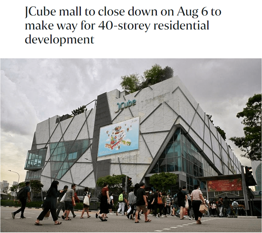 昨日,新加坡裕廊东(Jurong East)的裕冰坊(Jcube)官宣,将从8月6日关闭,所有商户全部都要在规定时间内搬迁,以便为结合商用楼面的住宅项目让步!