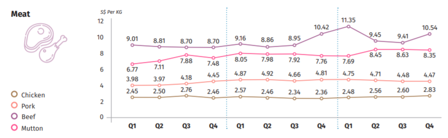 根据新加坡食品局去年公布的数据,肉类价格虽然历经波动,但比起2019年,去年的价格每公斤贵了有几毛钱至1块多不等。