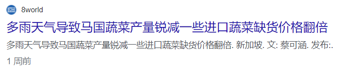 蔬菜价格也不便宜,就在一周前,新加坡的一些进口蔬菜价格直接翻番......几乎没有任何自然资源也不怎么产蔬菜的新加坡,食物价格可以说是“处处受制于人”。