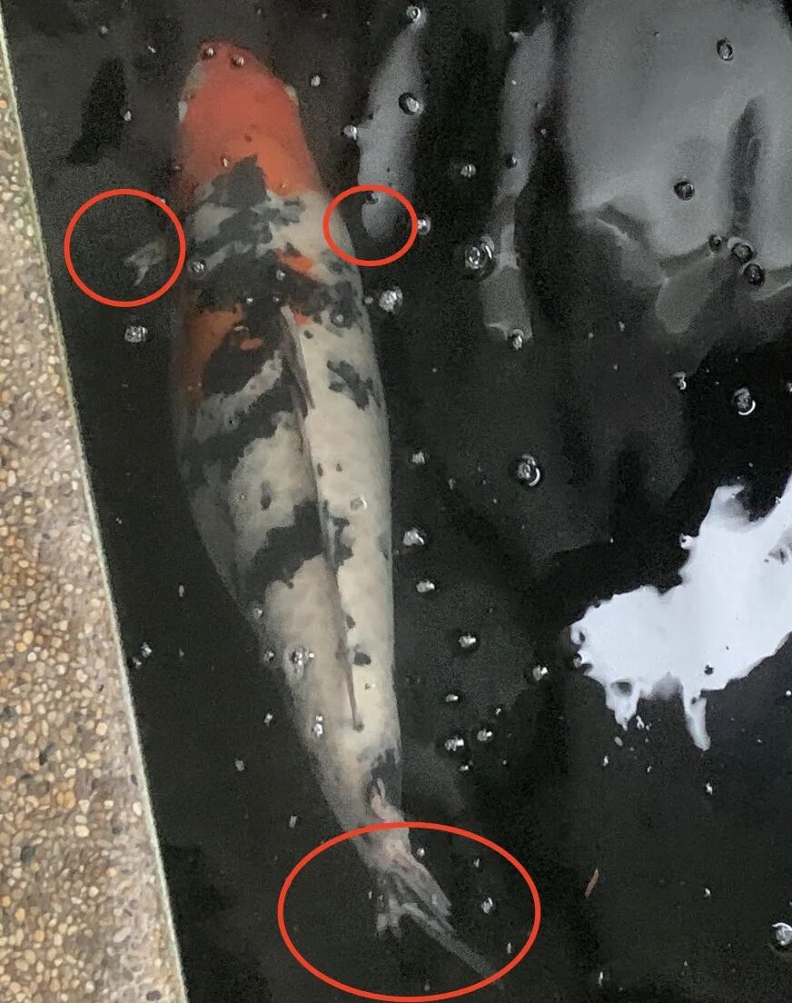 鱼池中仅3条鱼幸存,其中一条是锦鲤,但它受伤很严重,胸鳍跟尾鳍都被啃食掉了。↓