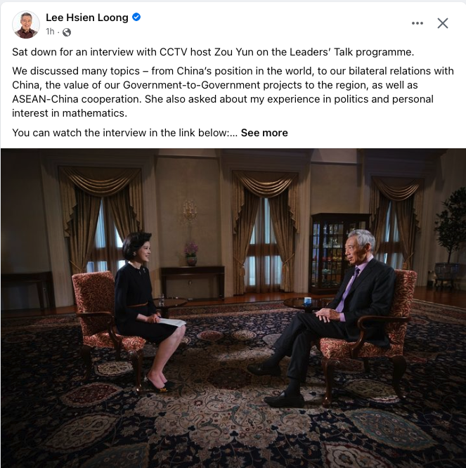 昨天,李显龙总理接受中国CCTV节目《高端访谈》采访,也以现场直播形式同时进行。