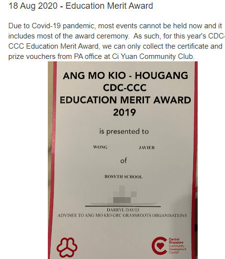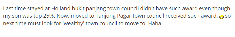 上次住在武吉班让市镇时,尽管我的儿子是前 25%,却没有获得这样的奖项。现在移居丹戎巴葛市镇,获得了这样的奖项。所以下次一定要找“富裕”的镇议会搬去。哈哈