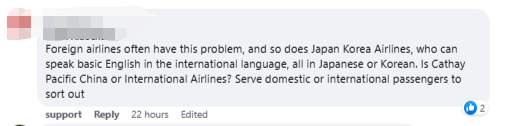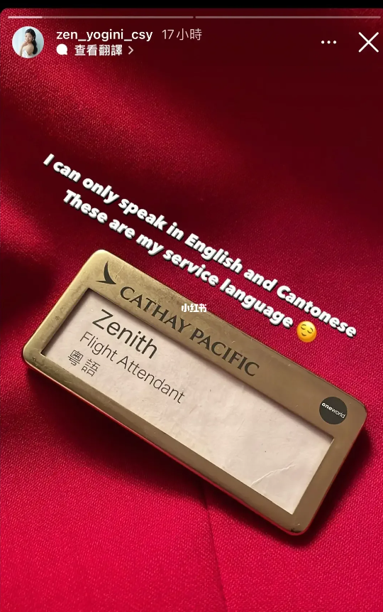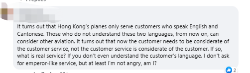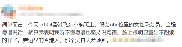 早前曾有国泰空姐在网上表示:“自己只会说粤语和英语,这两种语言就是我的公务语言。”