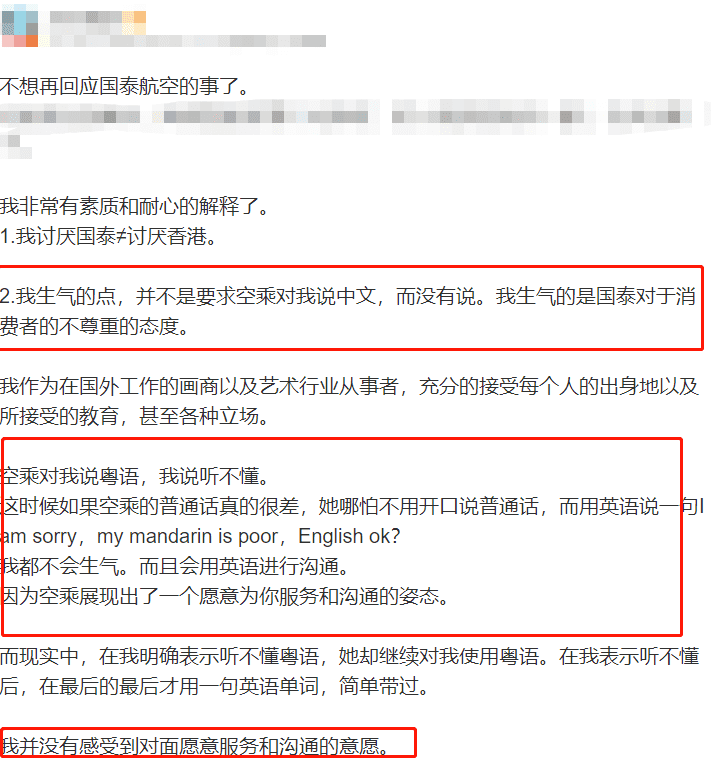 前日晚上,该网友更新动态表示:不想再回应国泰航空一事了!