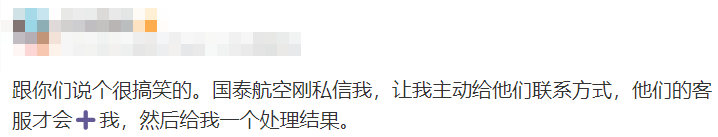 事后,网友接到了国泰航空的私信,让他主动给个联系方式,之后会有客服联系给出一个处理结果。