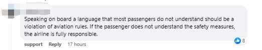 此外网友透露,在自己表示听不懂粤语后,还有一名女空姐再用粤语问话,猜测应该是问自己喝什么。