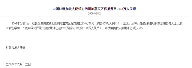 中国驻新加坡大使馆发文告表示,已经接待新加坡各界捐款民众达4万人次!截止到当年6月份,总捐款额已经达到了9113万人民币!