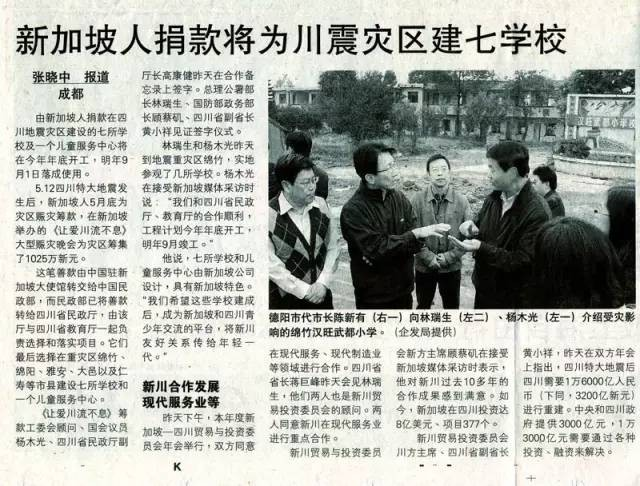 新加坡对汶川地震的灾后重建工作,贡献出了相当大的力量。