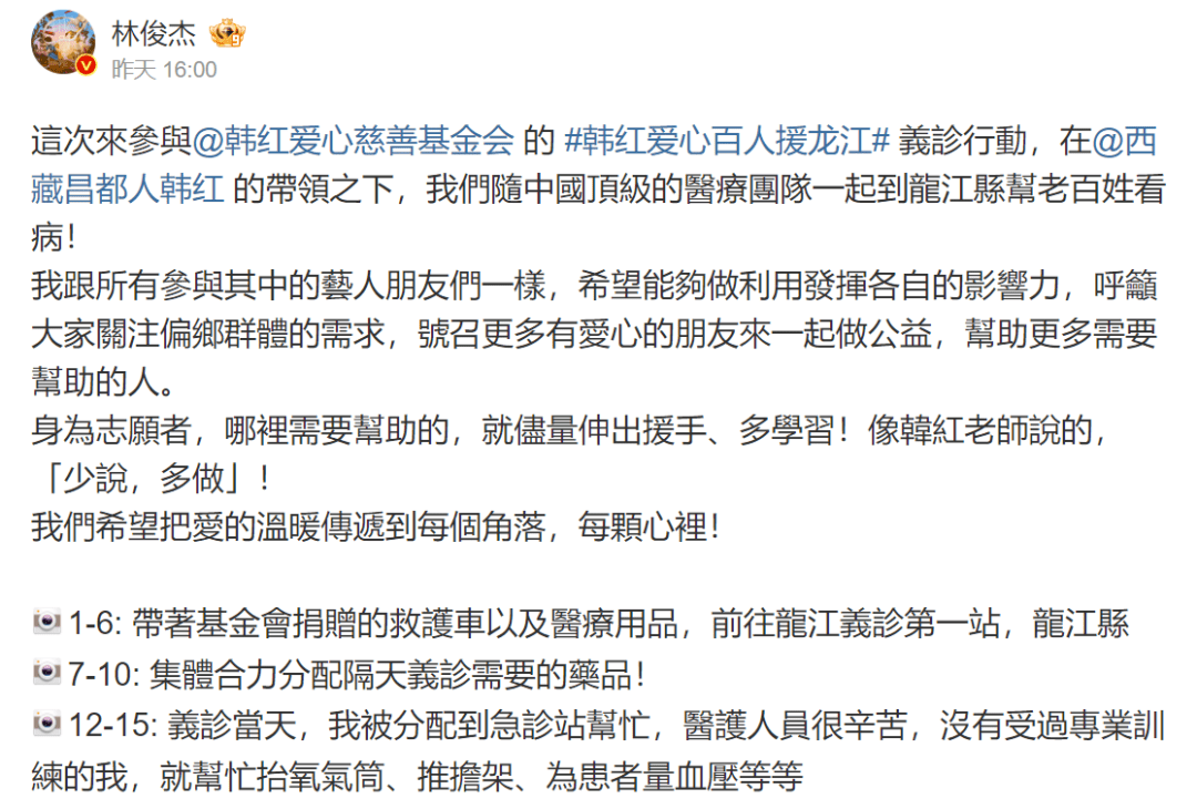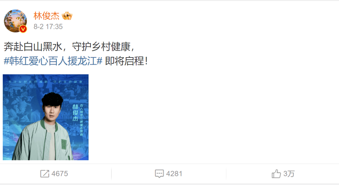 8月2日,林俊杰在微博上宣布,将加入由韩红基金会发起的“爱心百人援龙江”活动,引起了不少人的关注和点赞。