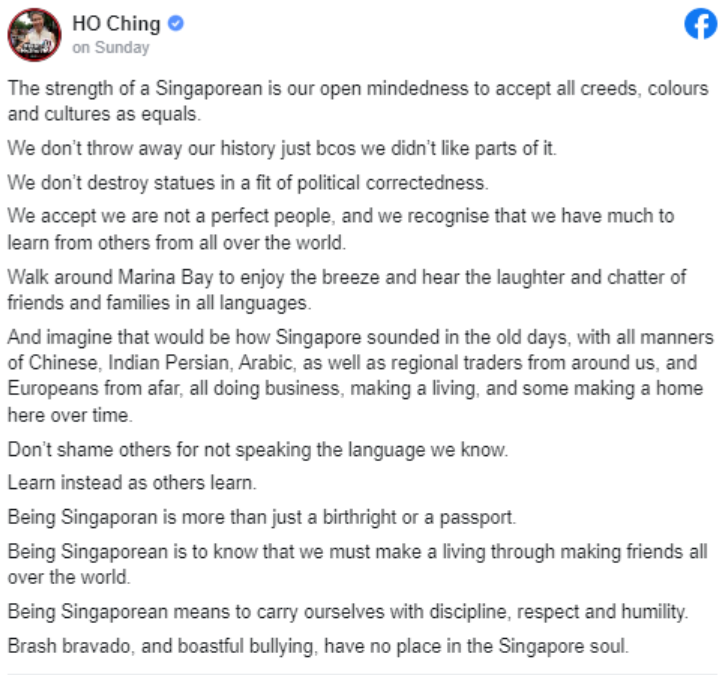 “身为新加坡人不仅是与生俱来的权利或持有我们的护照。身为新加坡人要懂得我们必须结交世界各地的朋友来讨生活。身为新加坡人要自律、尊重、谦虚。‘新加坡魂’无法容忍傲慢的虚张声势和自大的霸凌行为。”