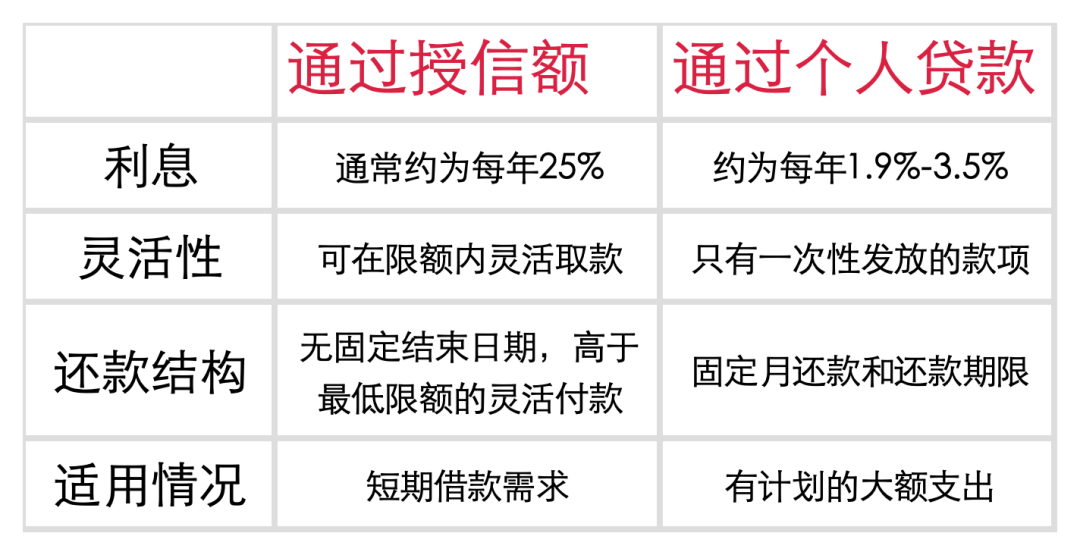 以下是关于通过授信额度(借款)与个人贷款之间区别的简明概述,可以看出两种方式都各有利弊,适合不同需求的人使用: