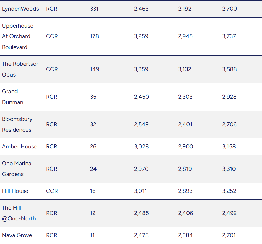 在销售分布上,中央区外围的表现尤为突出,贡献了513个交易量,占总销售的54.6%。特别是LyndenWoods住宅项目销售火热,月内售出的大多数单位价格都在每平方英尺2,463新元左右。