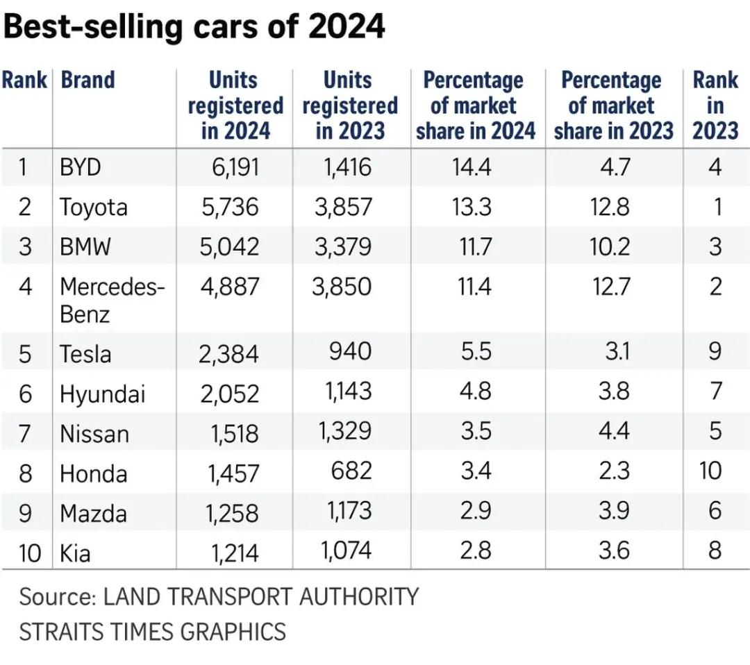 2024年全年注册量达到了6191辆,击败常年位居新加坡销量榜首的日本丰田和德国宝马!