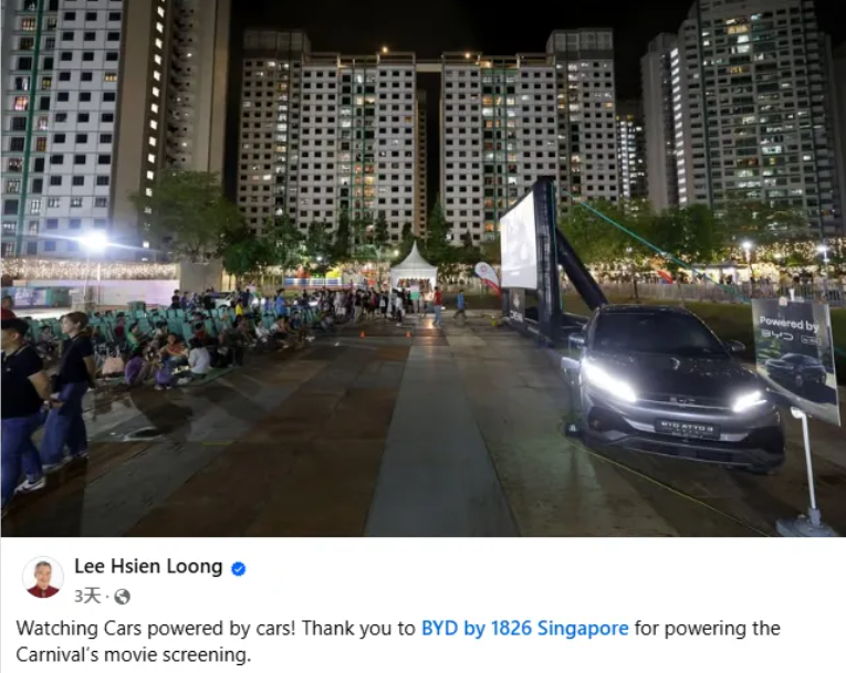 比亚迪直接把元Plus(在新加坡卖的叫BYD Atto 3)开到了活动会场,直接当成了移动充电站放露天电影!连新加坡前总理、现国务资政李显龙都专门发文“Thank You”了~