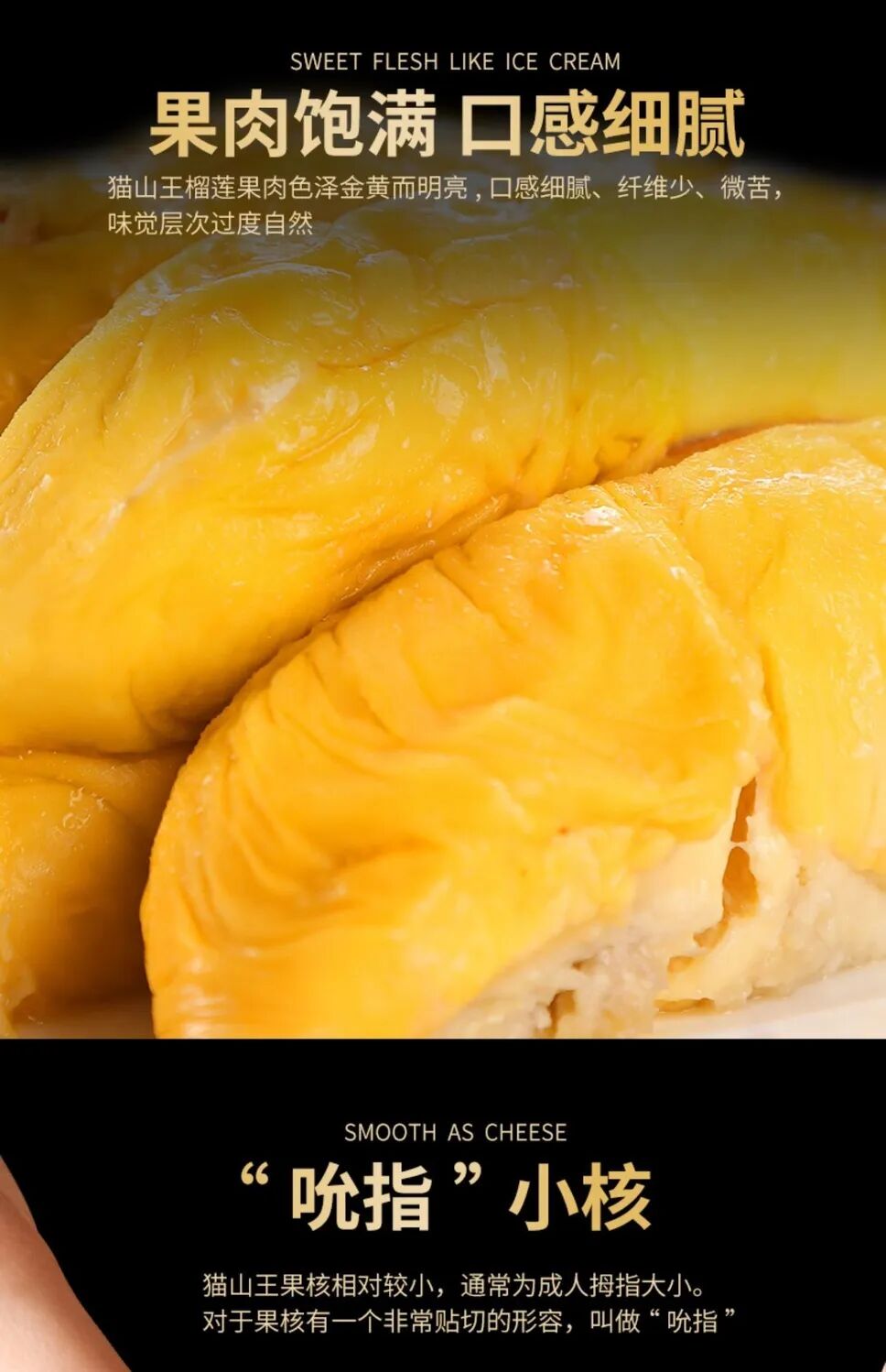 这种原产地、好口碑猫山王榴莲,果肉厚核小,入口即溶,然后缓慢僈散回甘果香,层次丰富,让人忍不住吮指回味!