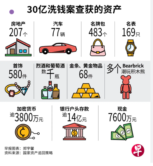 有上百套豪宅、十几辆豪车、数百个奢侈品包、现金、金条、比特币钱包……总值高达 超过30亿新币!