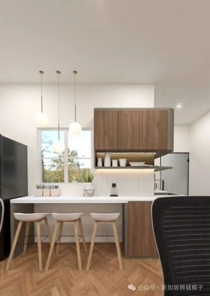 全落地保留式窗户,采光极佳;Peranakan 风瓷砖茶水间,复古有格调,提升空间独特性。