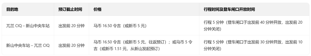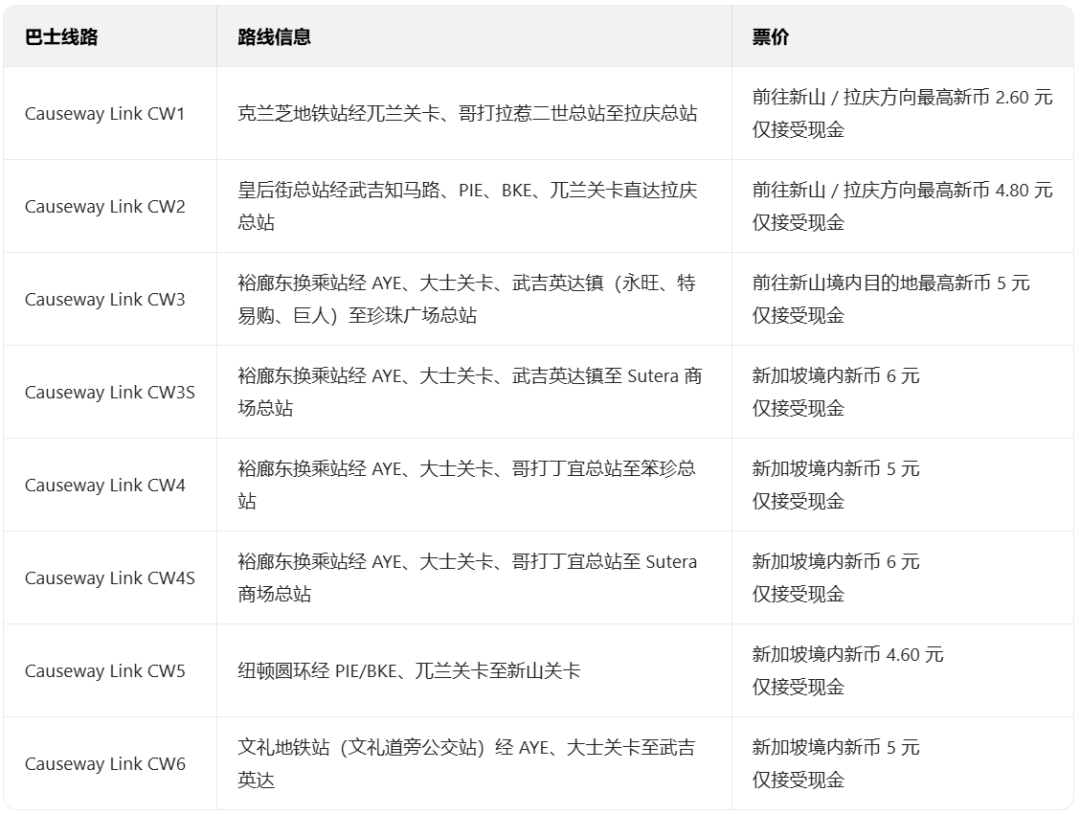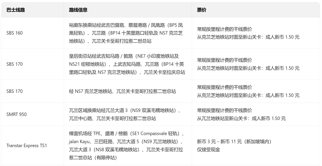 票价规则:分两类,一类是常规里程计费的干线票价(如 SBS、SMRT 线路,从克兰芝 / 兀兰地铁站到新山关卡成人 1.50 新元)、另一类是固定区间票价(如 Transtar、Advance Coach 等线路,新加坡境内 3 - 11 新元不等,部分仅收现金,Advance Coach AC7 支持易通卡支付、Singapore-Johore Express 分新加坡段和新山段票价,且需另付设施费)。