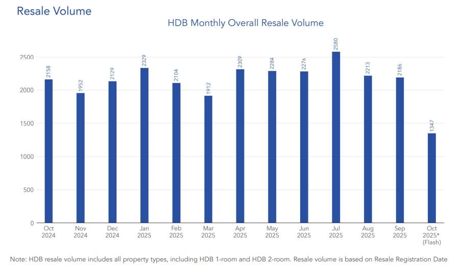 继前几个月的转售活动加剧后,组屋转售交易量在10月出现下降。共有1347套转售组屋成交,成为2025年交易较淡的月份之一。