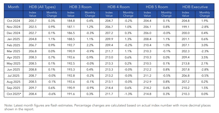在不同房型中,三房式和五房式组屋录得0.3%的温和增长,显示了来自"户型优化"家庭和寻求更大生活空间买家的持续需求。相比之下,四房式组屋价格下跌1.3%,而公寓式组屋的价格则与9月持平。