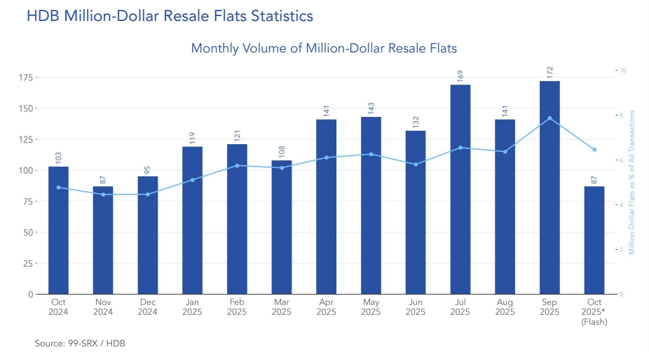 百万新元组屋转售交易数量在10月降至87套,低于9月的172套。这些交易占总销售额的6.5%,表明与9月(当时此类组屋占比达到有记录以来的最高月度比例)相比明显放缓。