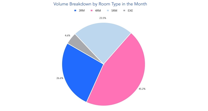 按房型细分,四房式单位继续主导市场,占全部销售额的45.2%,其次是三房式组屋(26.6%)、五房式组屋(23.5%)和公寓式组屋(4.6%)。