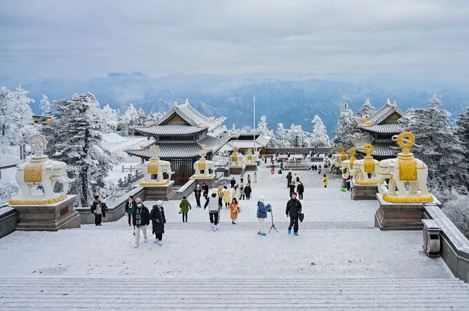 12 月中旬至 3 月初,联合国教科文组织世界遗产峨眉山化身雪域秘境,金佛与古寺相映。