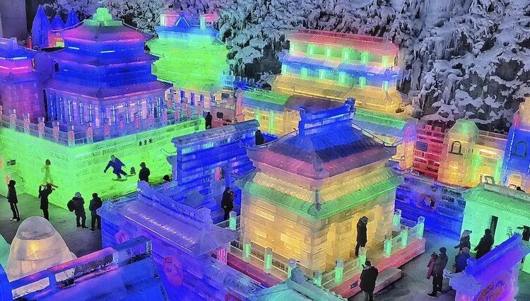 北京 龙庆峡1-2 月举办冰雪节,400 余座冰雕、冰滑梯与 70 米冰瀑灯光璀璨,还有烟花、无人机表演等,而且距城近、人少,适合一日游。