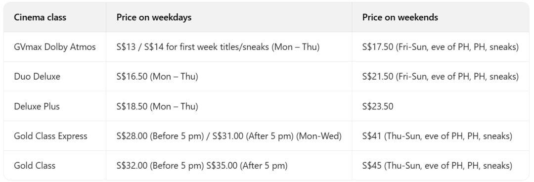 GV Movie票价略高于 Shaw,工作日普通票 S$11.50–S$12,周末 S$16,不过它凭借丰富的影院类型,主打更高端的观影体验,以此形成差异化优势。