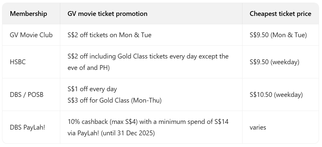 工作日最便宜的是 Shaw 影院,GV Movie Club(周二 S$7)、汇丰电影卡(S$7)有最优优惠