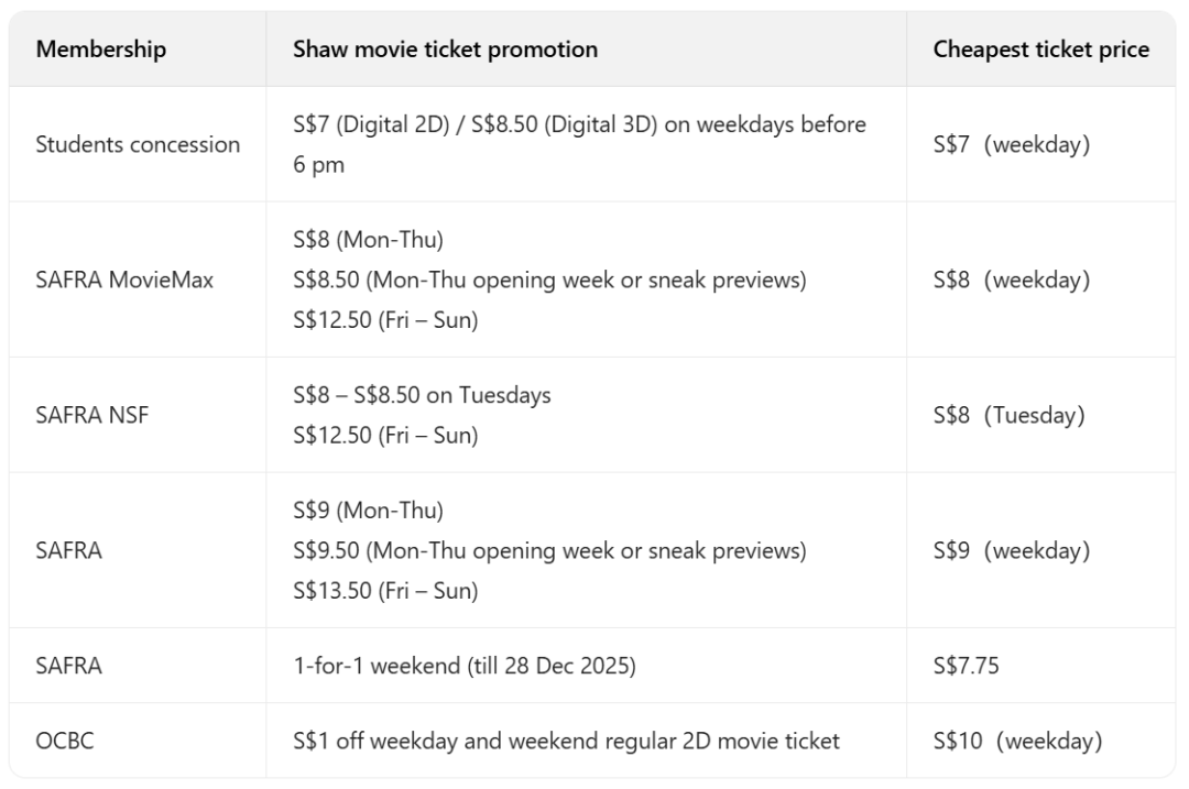 - 新加坡影院行业虽收缩,但观影仍是重要社交娱乐,2025 票价指南显示,Shaw 工作日票价最低,周末与 EagleWings 持平,GV 等影院及信用卡、会员优惠可降低成本,多款促销适配不同观众。