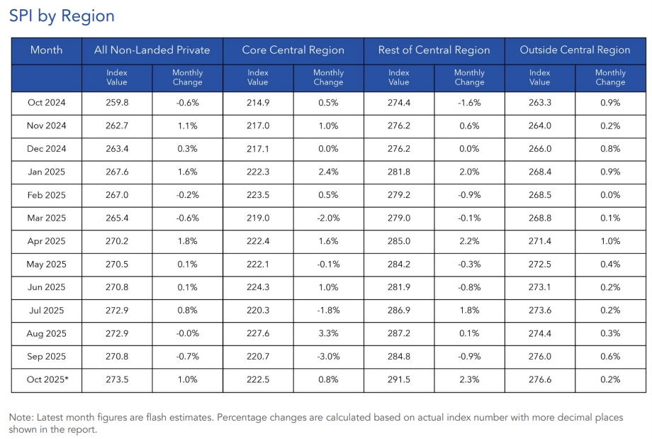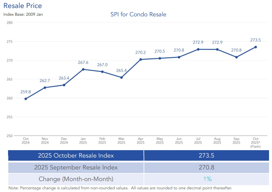 10月份,公寓转售价格指数环比上涨1%,从9月的270.8点升至273.5点。与2024年10月相比,价格同比上涨5.3%。