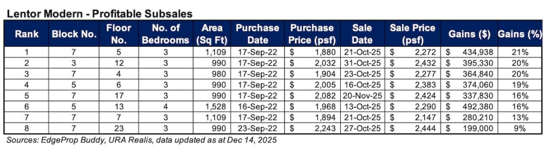 自那以来,项目已录得8宗转售交易。其中7宗实现了13%至21% 的双位数收益,另1宗单位也录得9%的涨幅。8宗转售中有7宗涉及面积介于980至1,109平方英尺的三卧房单位,剩余1宗则为1,528平方英尺的四卧房单位。