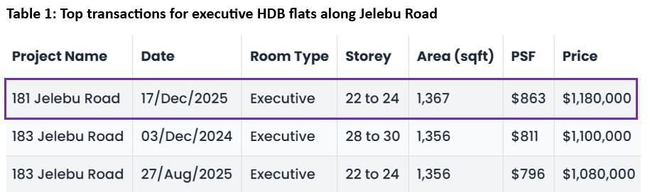 最近的这笔交易超越了此前在2024年12月创下的110万新元(每平方英尺811新元)的纪录。该纪录由附近惹兰勿刹路183号的一套公寓式组屋创造,面积为1,356平方英尺,位于第28至30层。与上述单位一样,其地契也始于2003年。